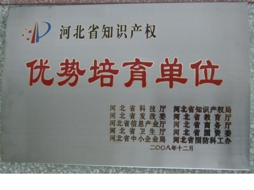 2008年12月,我公司被河北省科技廳、河北省知識產權局、河北省發改委、河北省教育廳、河北省信息產業廳、河北省商務廳、河北省衛生廳、河北省國資委、河北省中小企業局、河北省國防科工辦評為“河北省知識產權優勢培育單位”。